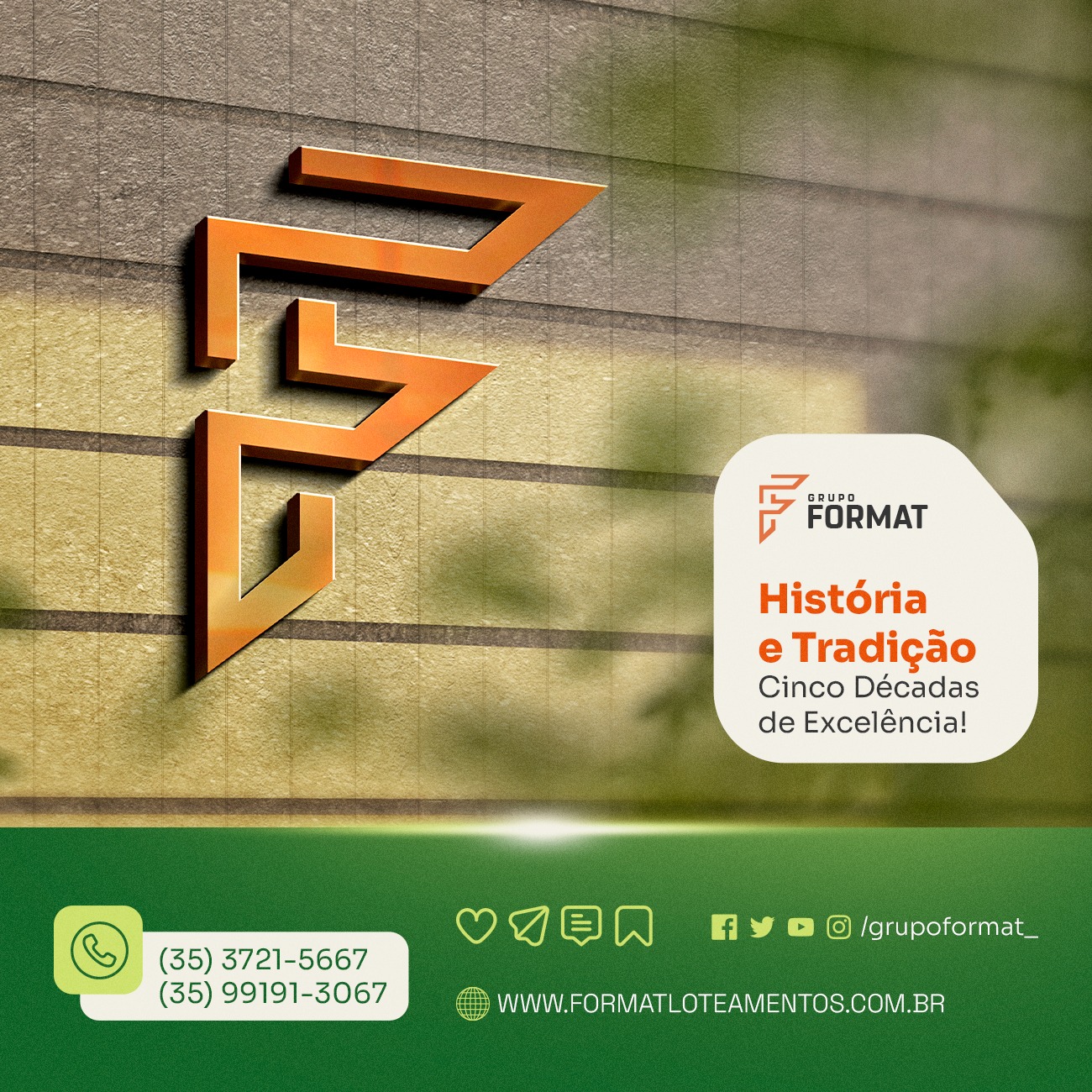 O Grupo Format iniciou seus trabalhos em 22/10/2007 através dos irmãos Alexandre Junqueira Bento Gonçalves, brasileiro, empresário, bacharel em direito pela faculdade Octavio Bastos e avaliador federal de imóveis; Adriana Junqueira Bento Gonçalves Garcia, brasileira, empresária, graduada em administração de empresas pela Autarquia Municipal de Ensino de Poços de Caldas e Catarina Junqueira Bento Gonçalves Franco, brasileira, empresária, graduada em educação física pela PUC Campinas, estes com vasta experiência em execução, administração e venda de imóveis. O objetivo da empresa é de executar obras de infraestrutura básica e construção civil no sul de Minas e região mogiana do estado de São Paulo.